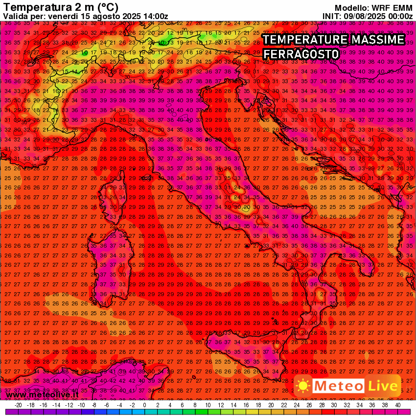Il nostro modello propone temperature esorbitanti al Settentrione, ancora una volta con valori diffusi tra 37 e 40 °C. Non molto distanti le temperature previste nelle zone interne del Centro, che supereranno abbondantemente i 35 °C. Solo qualche grado in meno al Sud Italia, ma con umidità elevata, il che renderà il caldo afoso soprattutto nelle principali città e lungo i litorali.