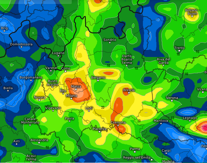 Saranno possibili anche locali grandinate e un singolo temporale potrà scaricare dai 10 ai 25mm di pioggia; capite bene che se i temporali dovessero essere 2-3, l’apporto in mm non sarebbe per nulla trascurabile, rinnovando localmente il rischio alluvionale, specie sulla Brianza già martoriata.