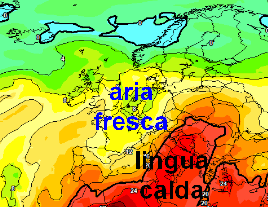 Le temperature a 1500m mettono in evidenza il contrasto termico previsto sul settentrione e la lingua calda che viene allontanata verso levante dalla spinta delle correnti fresche in ingresso da ovest. Qui sotto vediamo l’impulso freddo che tenterà di sfondare da ovest: