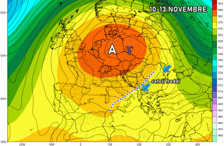 Il prosieguo non lascia tanti dubbi:. l’anticiclone tornerà ad inglobare gran parte dell’Europa centro-occidentale, allontanando nuovamente le perturbazioni atlantiche dal Mediterraneo. Tranne qualche rapido piovasco tra 9 e 10 novembre al nord ed aria più fredda dopo l’11 novembre al sud, c’è ben poco di cui discutere.