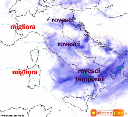 EVOLUZIONE FINE SETTIMANA: già nella mattinata di sabato tempo in miglioramento quasi ovunque ma instabilità residua pomeridiana è attesa al centro e al sud, mentre il transito di un ulteriore impulso instabile lungo le Alpi favorirà su queste zone nuovi rovesci sparsi nel tardo pomeriggio. Domenica più sole ovunque ma sempre con rischio di qualche spunto temporalesco pomeridiano.