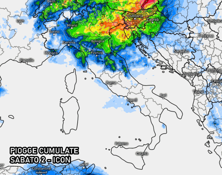 Anche il modello ICON è concorde sul tanto maltempo atteso sulle regioni del nord, in particolar modo sul nordest, e a sprazzi anche sulle regioni centrali tra Marche, Toscana e Umbria. Sul resto d’Italia il tempo sarà più asciutto e soprattutto un po’ più caldo, ma senza eccessi.