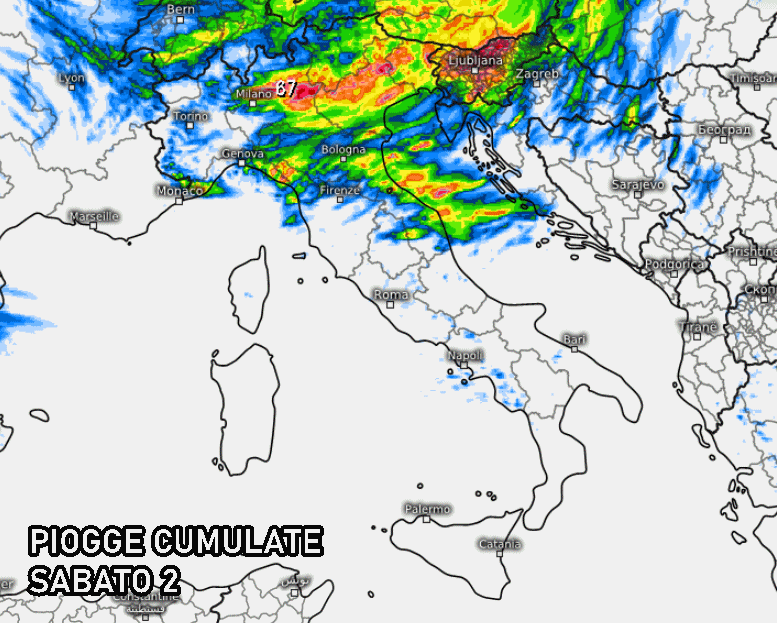 La giornata più critica sarà quella di sabato 2 agosto, su tutto il Nord Italia e localmente anche sulle regioni centrali. Gli ultimissimi aggiornamenti dei modelli matematici a scala locale suggeriscono lo sviluppo di numerosi e frequenti temporali su gran parte del nord, in maniera particolare sulla Val padana centro-orientale, dove potrebbero concentrarsi i fenomeni più violenti. Non a caso si prevedono quantitativi di pioggia localmente superiori ai 50 mm in breve tempo, segno della presenza di temporali particolarmente sostenuti, capaci di generare pioggia a carattere di nubifragio.