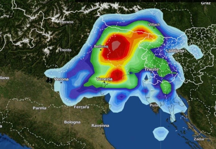 Il quadro inizierà però a cambiare nel tardo pomeriggio, quando una lieve flessione del campo barico secondo il modello ICON favorirà l’ingresso di aria più fresca in quota. Non si tratterà di un peggioramento organizzato, ma di un disturbo sufficiente ad aumentare l’instabilità serale sul Veneto e sul Friuli Venezia Giulia, con rischio di temporali anche violenti in movimento dai monti verso la pianura e la linea di costa, li vediamo qui su base grafica Wetterdienst: