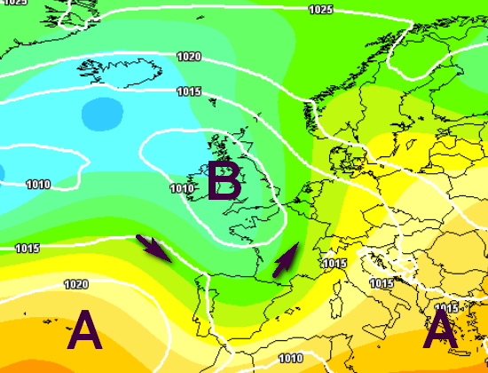 In seguito è atteso un cambio di circolazione: una saccatura si porterà sull’ovest del Continente attivando correnti nettamente più miti ma umide al nord, più secche e calde al centro e al sud, come vediamo qui sotto per il week-end 27-28 aprile: