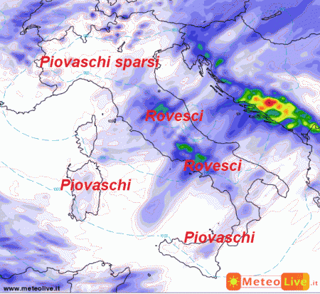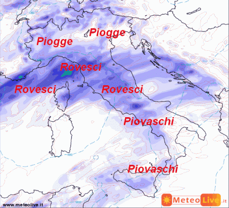 Ecco le piogge o i rovesci che interesseranno gran parte d’Italia, ma in modo particolare le regioni centrali. Pioverà anche al nord e al meridione. Tempo asciutto invece sulla Sardegna e le estreme regioni meridionali. Scirocco sostenuto sul Tirreno, temperature miti anche se in calo rispetto ai giorni scorsi per via del mancato soleggiamento.