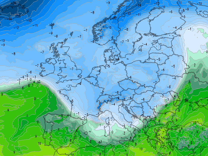 Ed ecco il calo termico notevole atteso tra centro Europa ed Italia tra mercoledì 20 e giovedì 21 a 1500m secondo il modello GFS: