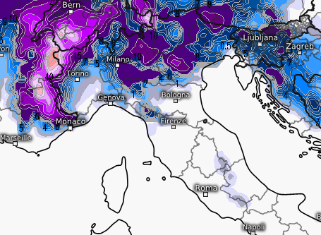 Ed eccone le conseguenze nevose, sempre secondo lo stesso modello, le macchie viole sottendono un quantitativo tra 5 e 10cm di neve, anche se le temperature al suolo e il conseguente attecchimento della neve (vista la distanza temporale) saranno tutte da verificare e potrebbero risultare sovrastimate: