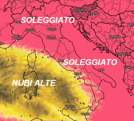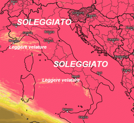 Un’area nuvolosa avanzerà verso la Sardegna, ma si tratterà di nubi medio-alte senza piogge. Velature in aumento anche su Sicilia e medio-basso Tirreno, per il resto nessun cambiamento. Scirocco in rinforzo sulle Isole, clima molto mite.