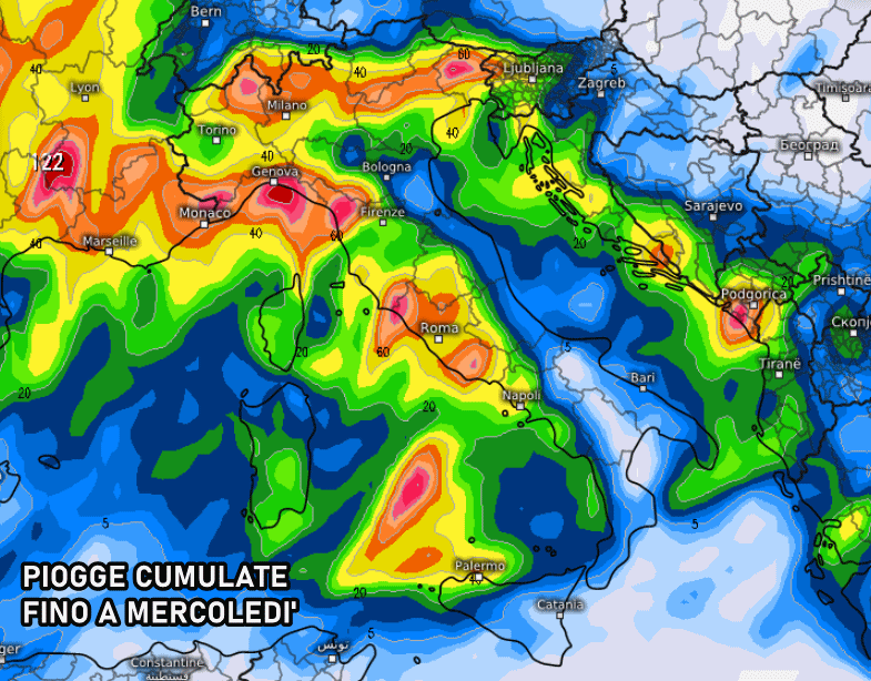 Di seguito possiamo osservare le piogge totali previste fino a mercoledì sera, appartenenti alla seconda perturbazione di Ottobre. Gli accumuli più importanti sono previsti sulla fascia alpina/prealpina, sulla Liguria, la Toscana e il Lazio, dove potrebbero precipitare oltre 50-70 mm: