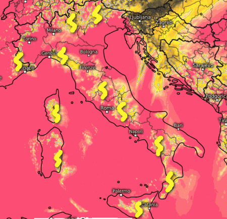 Giornata molto temporalesca su parte delle regioni centrali e al meridione, specie nei settori interni, ma con possibili sconfinamenti costieri. Tempo più stabile al nord e sulla Sardegna a parte nubi pomeridiane senza conseguenze. Temperature in calo al centro e al sud, stazionarie al nord.