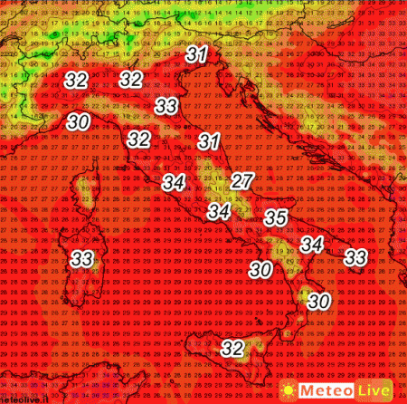 Valori elevati, ma abbastanza in linea con le medie di una giornata di piena estate. Segnaliamo 35° sul Foggiano e 34° lungo il Tirreno e sulla bassa Lucania.
