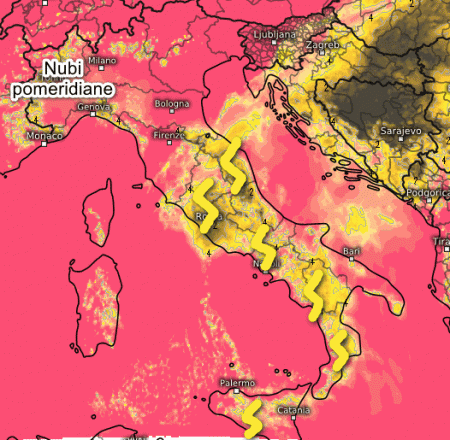 Cosa succederà in Italia nella giornata odierna? Iniziamo con la mappa del soleggiamento totale cumulato previsto tra le 9 e le 16 di lunedi 8 agosto (rosa molto soleggiato, giallo nubi e schiarite, grigio scuro assenza di sole):