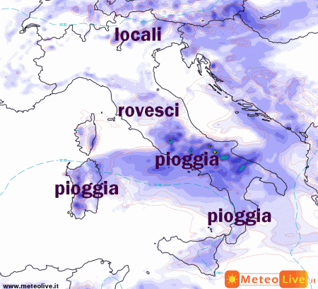 EVOLUZIONE: venerdì moderato maltempo al sud con piogge e temporali, migliora al centro, salvo rovesci pomeridiani sul medio Adriatico, bel tempo al nord, qui la mappa dei fenomeni previsti:
