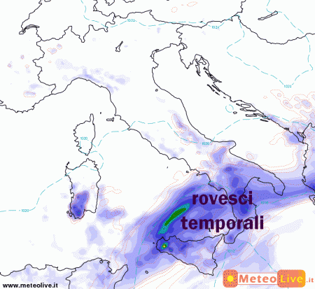 SITUAZIONE: l’Italia è interessata da una perturbazione che indugia soprattutto al centro e al sud, determinando fenomeni temporaleschi soprattutto su basso Lazio, Campania, basso Tirreno, in estensione ad Abruzzo e resto del meridione nel corso della giornata. Focolai temporaleschi saranno probabili anche sul resto del centro e marginalmente sul Triveneto, come si nota da questa mappa prevista per il pomeriggio: