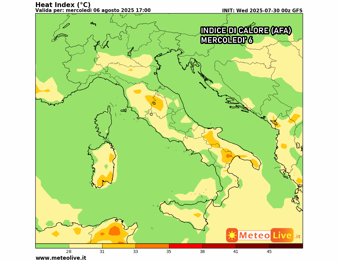Dal 6 agosto in poi le carte in tavola cominceranno pian piano a cambiare, poiché l’alta pressione rischia di gonfiarsi nuovamente su tutto il Mediterraneo e richiamare aria più calda dal Nordafrica e dal settore atlantico subtropicale. Inizialmente si tratterà di un anticiclone ibrido, ovvero in parte oceanico e in parte nordafricano, ragion per cui il caldo sarà ancora non eccessivo. Tra il 6 e l’8 agosto, infatti, avremo chiaramente giornate più calde, con temperature massime localmente oltre i 31–32 °C, ma con un indice di calore medio-basso.
