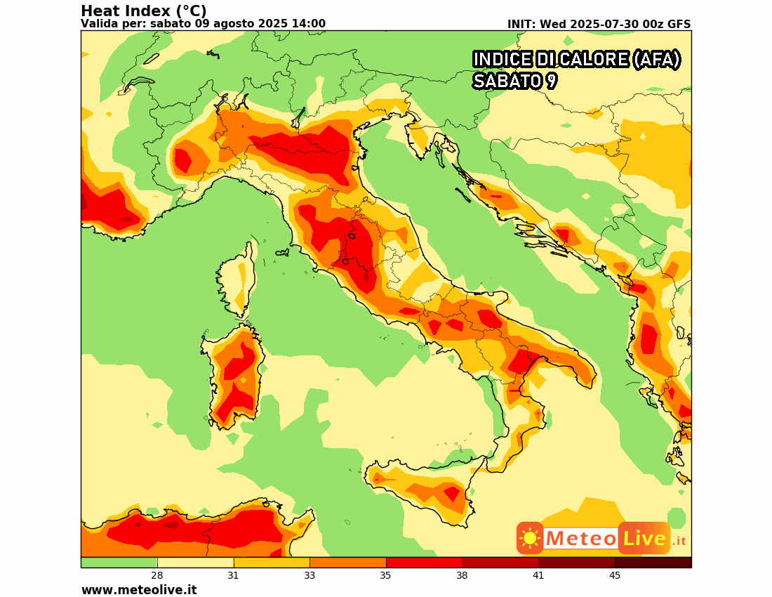 Da sabato 9 agosto il promontorio africano potrebbe consolidarsi ulteriormente su tutta Italia, favorendo un brusco aumento delle temperature e anche dell’umidità, rendendo di fatto il caldo parecchio più afoso e a tratti fastidioso. Non a caso, le mappe indicano un indice di calore medio-alto, specie in Val Padana e su diverse località del Centro-Sud, a causa degli eccessivi tassi di umidità uniti a temperature ben più alte delle medie tipiche del periodo.
