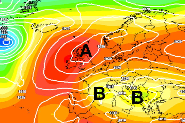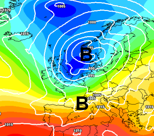 -Lo sfondamento dell’aria fresca di matrice polare continentale sino all’ovest del Continente porterà ad un generale indebolimento dell’anticiclone che dovrebbe lasciare il posto nuovamente ad una vivace circolazione occidentale con tempo variabile da domenica 22 a mercoledì 25, quando si prevede l’inserimento di una nuova saccatura di origine artica. Naturalmente, stante la distanza temporale sarà opportuno aggiornarsi su queste che sono solo proiezioni. Ecco comunque la mappa che illustra il quadro barico appena descritto: