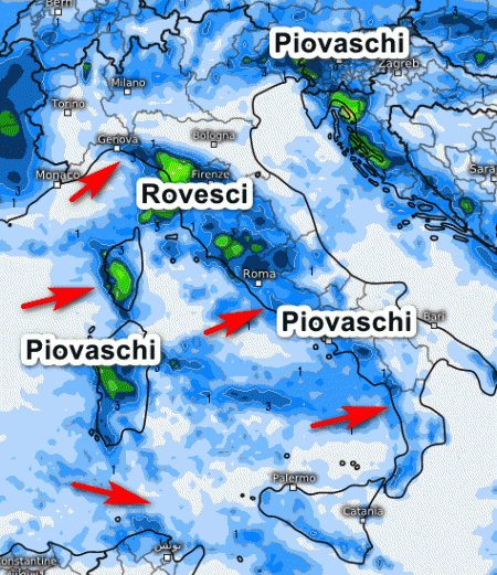 Ci sono comunque alcune aree fortunate che prendono queste correnti in faccia (effetto stau)…e allora l’aiuto dei rilievi diventa di vitale importanza per consentire rovesci anche di buona fattura, come ad esempio è successo ieri in Toscana. Tuttavia, le piogge attese in Italia sono altre e si spera arrivino al più presto.