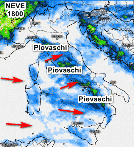 Nevicate sui settori confinali della Val d’Aosta oltre i 1800 metri. Piovaschi lungo il Tirreno e le aree interne del centro, per il resto tempo asciutto. Ventoso per venti da ovest e clima mite.