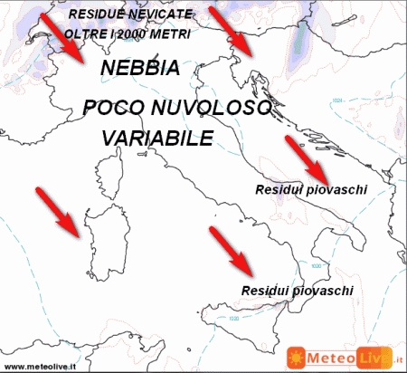 Residue nevicate sui settori esteri delle Alpi oltre i 2000 metri, ma in attenuazione nell’arco della giornata. Nubi e qualche isolato piovasco tra la Sicilia settentrionale, la bassa Calabria e il Gargano. Su tutte le altre regioni cielo poco-nuvoloso o variabile per il transito di nubi alte e sottili. Banchi di nebbia su diversi settori della Pianura Padana, in dissolvimento solo parziale nell’arco della giornata. Ancora vento forte da nord-ovest su Alpi, Sardegna e regioni meridionali, ventilazione debole altrove.