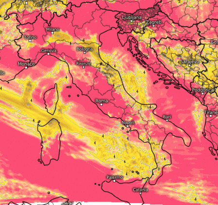 Soleggiamento un po’ compromesso lungo il versante adriatico, specie tra Marche, Umbria orientale e Abruzzo dove non si esclude qualche debole pioggia. Nubi anche sulla Sardegna e sulla Calabria senza fenomeni, per il resto soleggiamento ottimo.