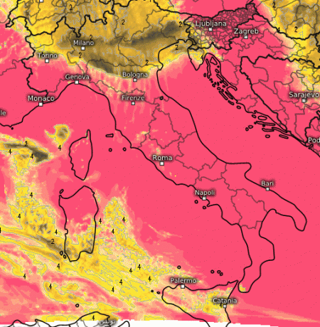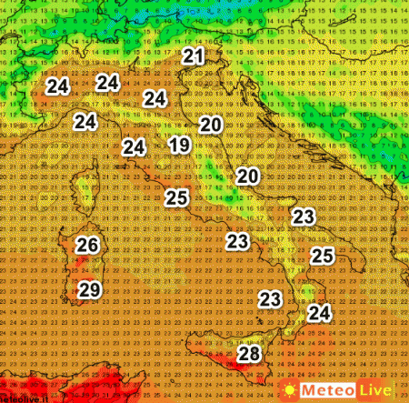 Punte di 29° sulla Sardegna meridionale, 28° in Sicilia, 26° sulla Sardegna settentrionale, 25° sulla bassa Lucania e sul Lazio. Altrove valori gradevoli.