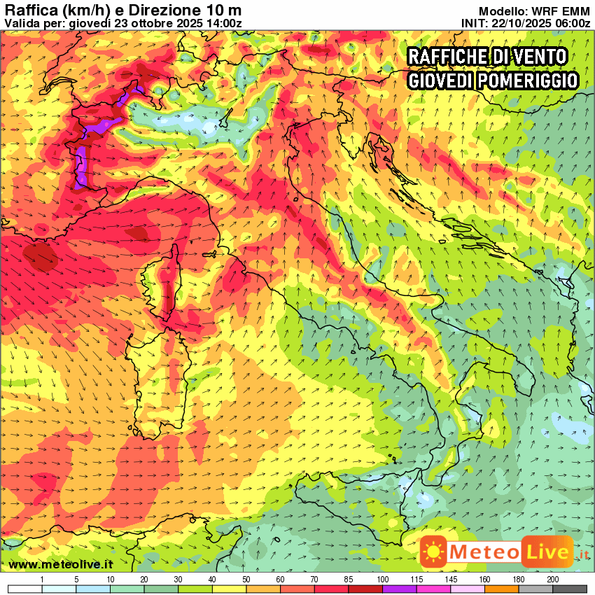 La pressione scenderà rapidamente in poche ore, fino a raggiungere i 990 hPa sul Nord Italia nel corso di giovedì pomeriggio. Un calo così significativo in tempi brevi produrrà inevitabilmente raffiche di libeccio violente, che sferzeranno il Centro e il Nord Italia, in particolare le zone montuose, dove si prevedono le raffiche più impetuose.