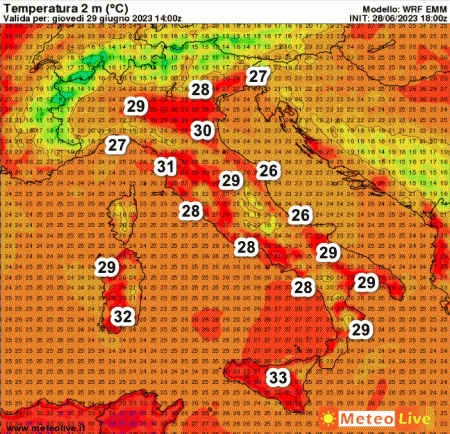 Condizioni di caldo in genere moderato sulla Penisola. Segnaliamo 33° in Sicilia, 32° nel sud della Sardegna e 30° sull’Emilia Romagna.