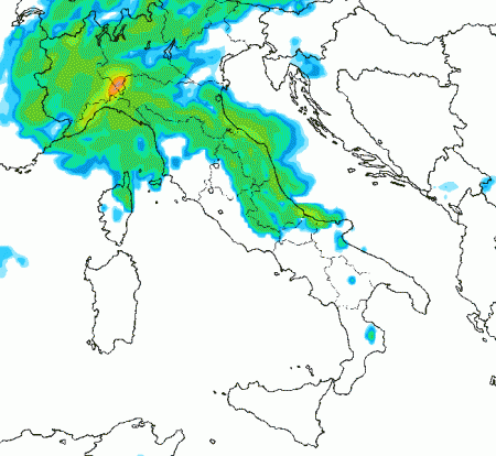 Andiamo però con ordine. La prima mappa fotografa la situazione di questo pomeriggio in Italia tra le 14 e le 17 – in verde le aree maggiormente soggette a temporali: