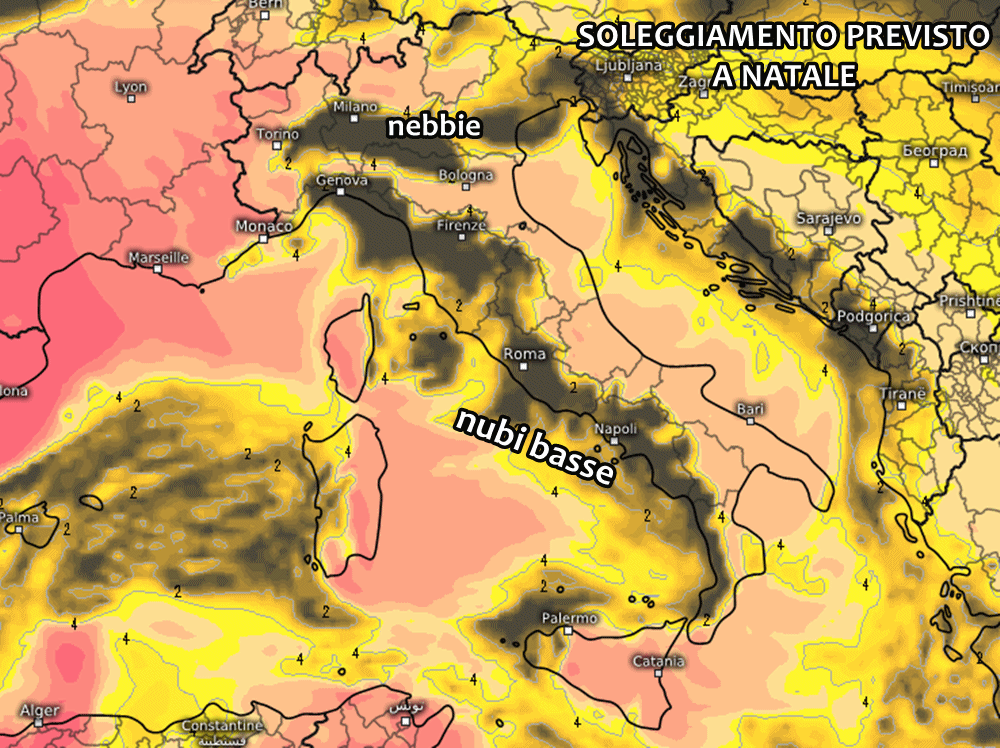 La mappa di seguito ci mostra chiaramente il soleggiamento previsto per Natale, quasi del tutto inesistente (in grigio scuro) in Val Padana e regioni tirreniche.