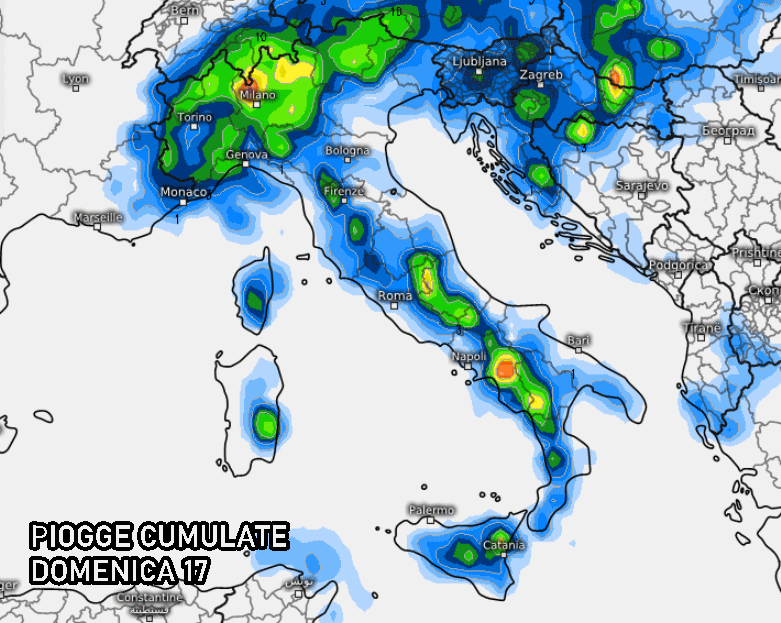 Molto più turbolenta sarà la giornata di domenica, che, come si evince dalla mappa, sarà condizionata da frequenti temporali pomeridiani nelle zone interne di quasi tutto il centro-sud. Montagne e colline saranno i settori più vulnerabili, ma non si esclude il transito di improvvisi scrosci di pioggia e colpi di vento anche sulle zone costiere dell’arco ionico e del basso Tirreno.