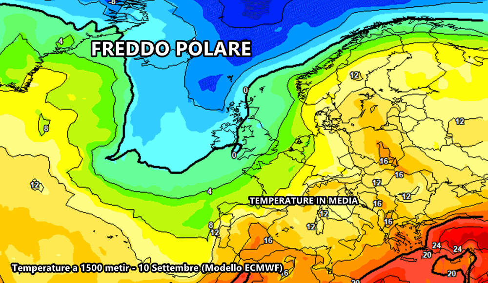Le temperature previste a 1500 metri tra 10 e 11 Settembre evidenziano il flusso freddo proveniente dal polo nord. L’isoterma 0 a 850 hpa toccherà la Gran Bretagna, mentre in Francia registreremo temperature pienamente autunnali. In Italia si notano isoterme tra i 12 e 15°C, decisamente più basse rispetto agli attuali 18-20°C.