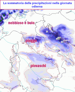 SITUAZIONE: una debole perturbazione attraversa rapidamente il Paese, ma si mostra più attiva al centro-sud, dove la giornata risulterà spesso piovosa, al nord tempo uggioso sulle pianure per nebbia o strati bassi, più sole su monti e coste, salvo sui settori alpini confinali, dove potrebbe registrarsi qualche debole nevicata.