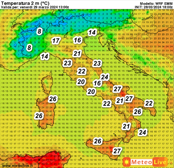 Quadro termico praticamente estivo su alcune aree del centro e del sud, mentre al nord-ovest sarà inverno. Ecco i valori previsti alle 14 di oggi pomeriggio: