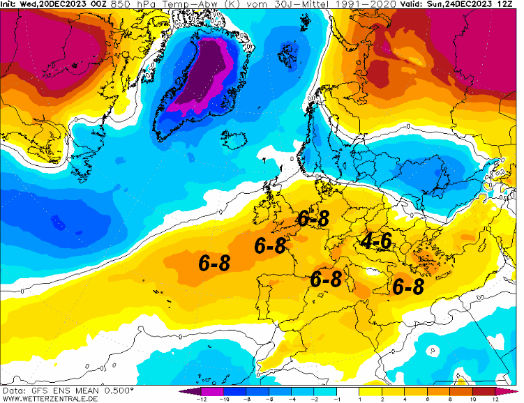 Ecco l’enorme plateaux di aria mite che invaderà vaste porzioni del nostro Continente, compresa ovviamente l’Italia. Sono attese anomalie termiche al rialzo comprese tra 6 e 8° tra le Isole Britanniche, il nord della Francia, il Mediterraneo occidentale e lo Ionio. Altrove avremo anomalie positive comprese in media tra 4 e 6°. Insomma, un Natale eccezionalmente mite su quasi tutta l’Europa.