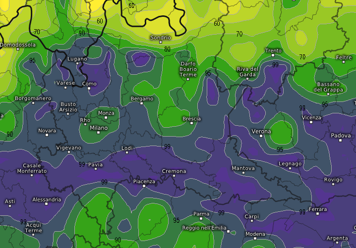 Qui una mappa dell’umidità prevista domenica mattina all’alba sul catino padano: in viola l’umidità pari al 100%, notate come nell’isola di calore urbana di Milano, il cemento la faccia calare al 90%, dunque è facile che in città gli strati nebbiosi si manifestino come nebbia alta, destinata a dissolversi già entro le 9-10 del mattino.