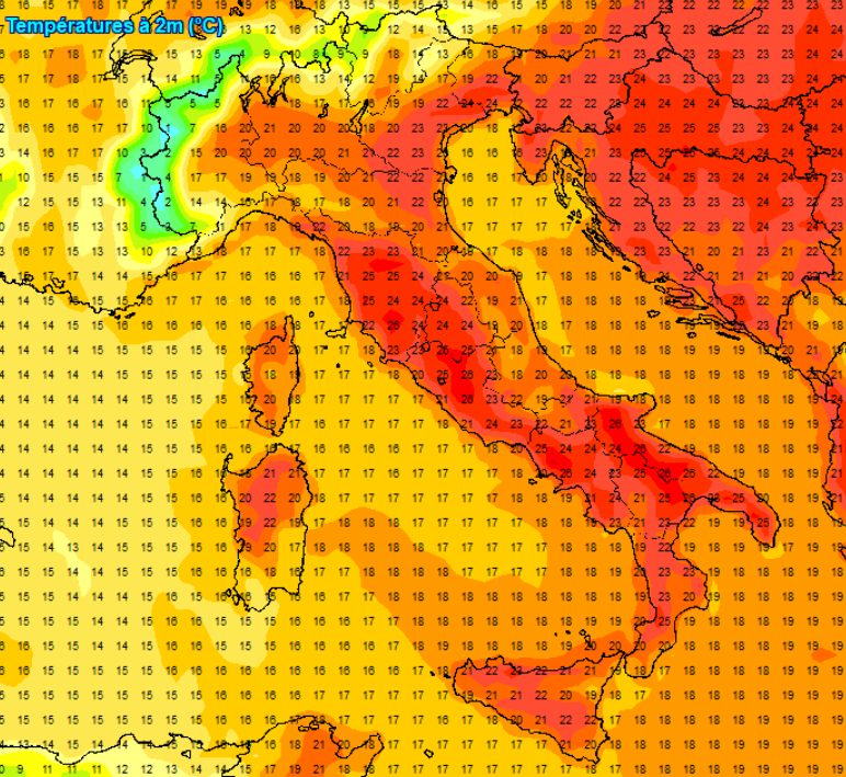 Passeremo dunque dai valori attesi per sabato 27 aprile alle ore 8 a 2m di altezza, ancora decisamente freschi al nord-ovest e lungo la dorsale appenninica, più alti al sud: