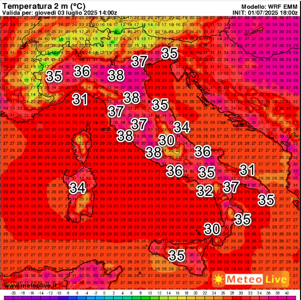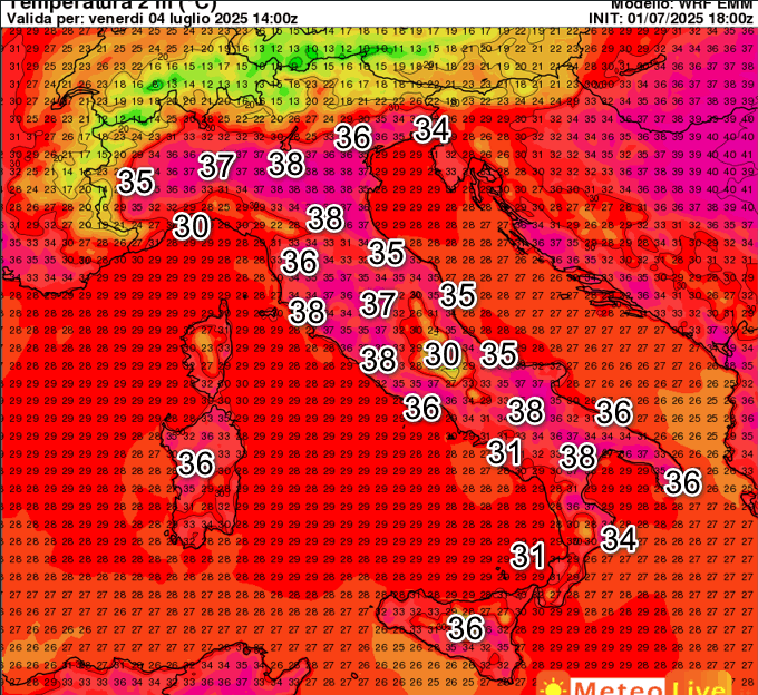 Nulla di cambiato. Ancora molte aree con 37-38° diffusi e caldo opprimente da nord a sud. Per avere un cambiamento ed un po’ di beneficio bisognerà attendere il fine settimana.