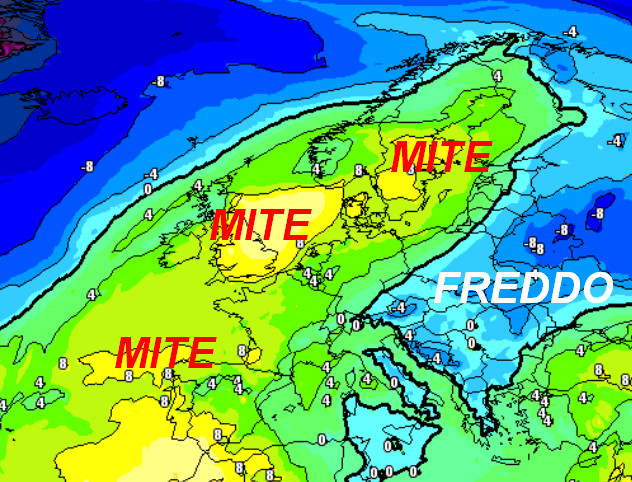 La prima mappa mostra le temperature a 1500 metri attese in Italia nelle ore centrali di mercoledi 25 dicembre, ovvero Natale:
