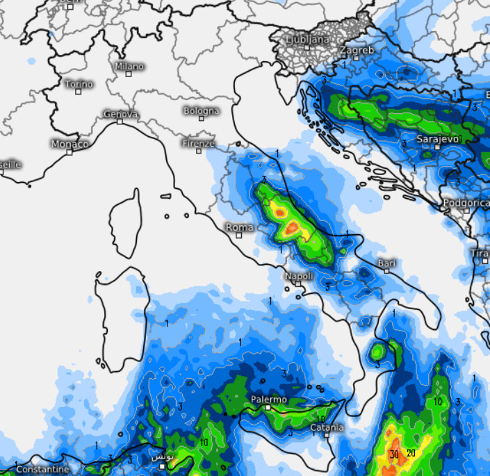 La seconda mappa mostra la sommatoria delle precipitazioni attese in Italia nell’arco della giornata natalizia: