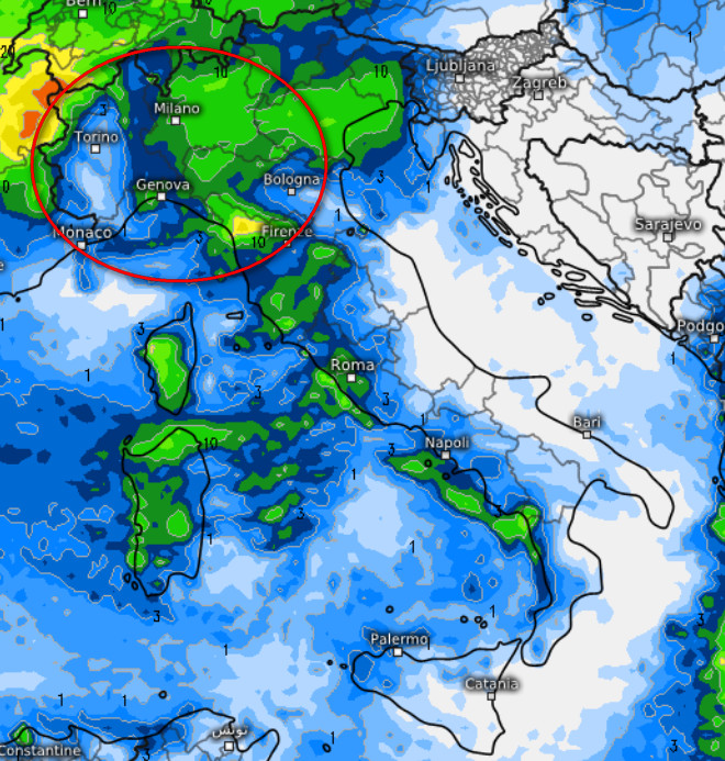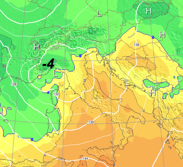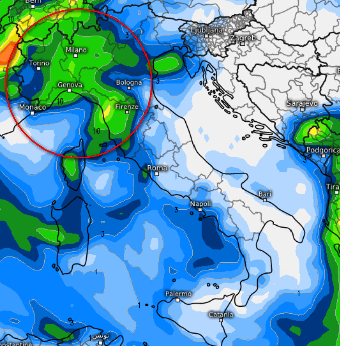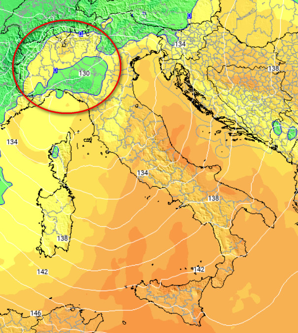 Cosa osserviamo? Una buona dose di precipitazioni che potrebbe ricoprire quasi tutto il settore di nord-ovest con isoterme a 1500 metri comprese tra -2 e -4. Tenuto anche conto che a 5000 metri di altezza avremo isoterme prossime a -30°, sarebbe lecito aspettarsi da questo modello cadute di neve anche sulle pianure di Piemonte, Lombardia e soprattutto sull’Appennino Ligure dove si avranno gli accumuli più abbondanti.