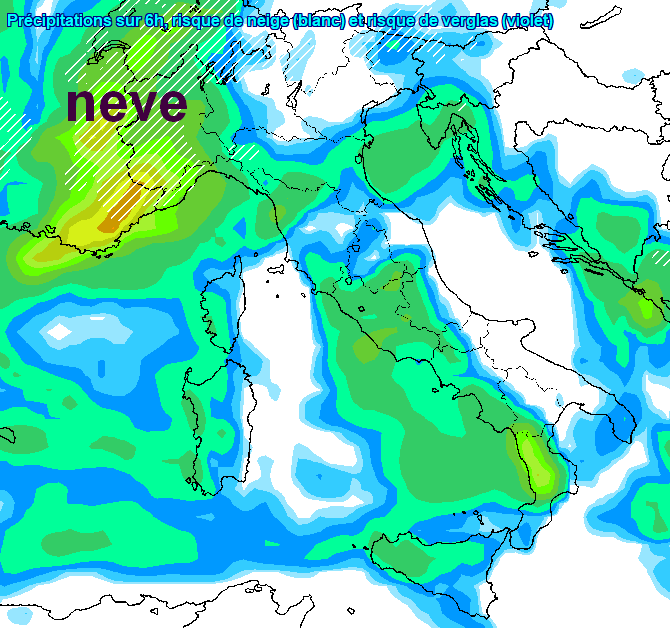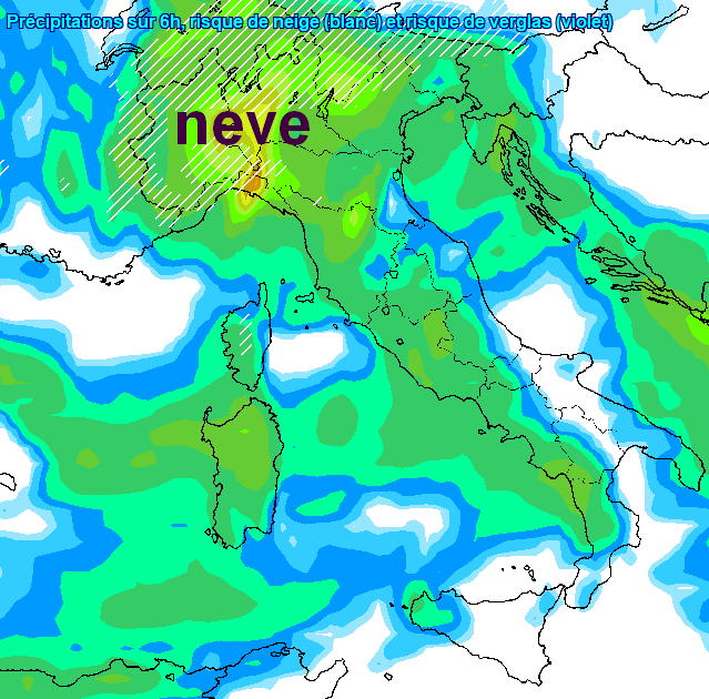 Il modello li prevede dapprima sul Piemonte nel primo mattino, poi misti a pioggia anche in Lombardia e in Val d’Adige e nel fondovalle del Cadore tra il primo pomeriggio e la sera, come vediamo da queste due mappe, da segnalare neve anche copiosa nel Cuneese: