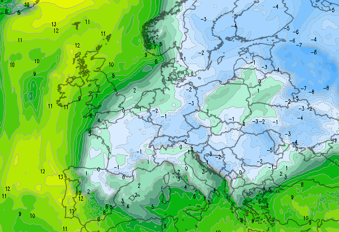 Potrebbe però nevicare a tratti oltre gli 800-1.000m di quota sulle Alpi occidentali, se passasse la linea del modello ECMWF, su quelle orientali se avesse ragione il modello GFS. Ecco una carta termica a 1500m prevista proprio per il 14 novembre secondo ECMWF:
