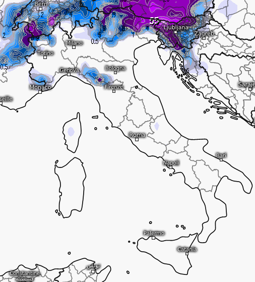 Il colore viola sottende accumuli superiori ai 15-20cm, quello azzurrino solo di pochi centimetri, buono l’apporto su zone confinali altoatesine, alto Cadore, Carnia e Tarvisiano, dove si prevedono anche picchi di mezzo metro di neve fresca oltre i 1500m secondo GFS, che invece snobba i restanti settori alpini: