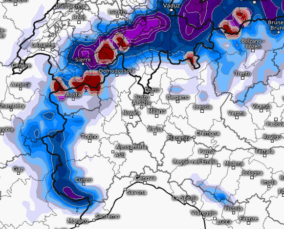 Le conseguenze sul piano precipitativo a livello nevoso le vediamo in queste due mappe, influenzate nella distribuzione dei fenomeni dal posizionamento del minimo pressorio al suolo, al momento assolutamente ballerino, la prima si rifà al modello ECMWF (ovest Alpi e zone di confine coinvolte):