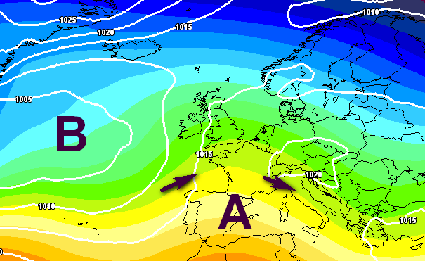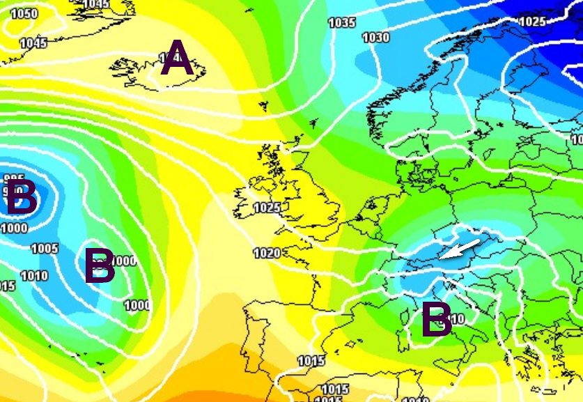La configurazione barica che porterebbe a questa evoluzione prevede anticicloni che dalle Azzorre si collegano con l’Islanda e l’Italia in balia di circolazioni depressionarie: