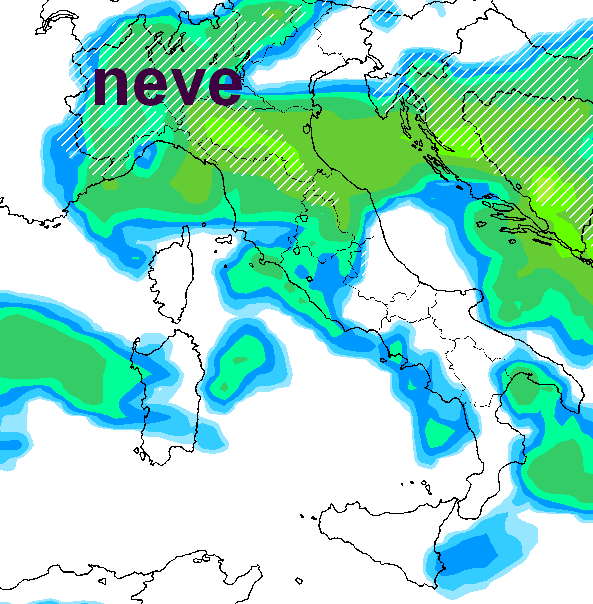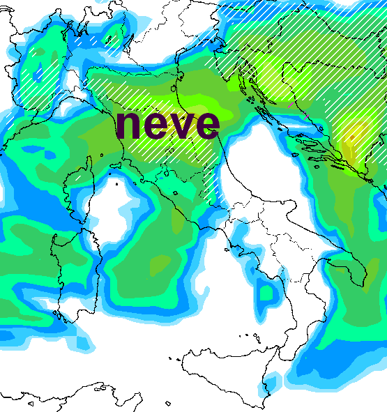 Che conseguenze ci sarebbero? Si svilupperebbero certamente rovesci nevosi sino in pianura su diverse zone della Valpadana e anche sui relativi tratti appenninici liguri ed emiliani, guardate che mappa: