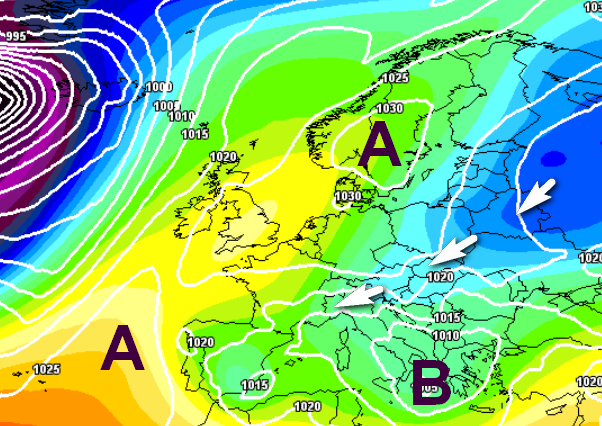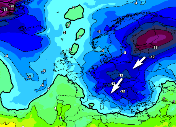Se sull’episodio del 3-4 novembre c’è però ancora molta incertezza, sull’evoluzione successiva quasi tutti sembrano convergere verso un temporaneo blocco dell’avanzata dell’aria mite atlantica, sul rafforzamento di un anticiclone sulla Scandinavia e sul rientro di aria fredda da est sull’Italia, come vediamo da questa analisi termica a 1500m prevista per il 6 febbraio: