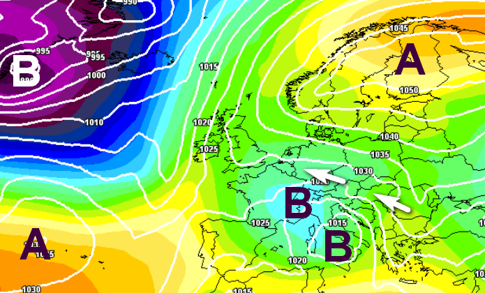 Diverse mappe prefigurano addirittura vortici freddi in quota in movimento retrogrado rispetto al normale andamento del tempo in Europa, in grado di scavare depressioni al suolo sull’Italia, foriere, stante temperature basse sino al suolo, di nevicate (pur bagnate o miste a pioggia) anche in pianura proprio sul settentrione e sulle zone interne del centro, come si nota qui in questa mappa forse un po’ estrema prevista per sabato 8 febbraio: